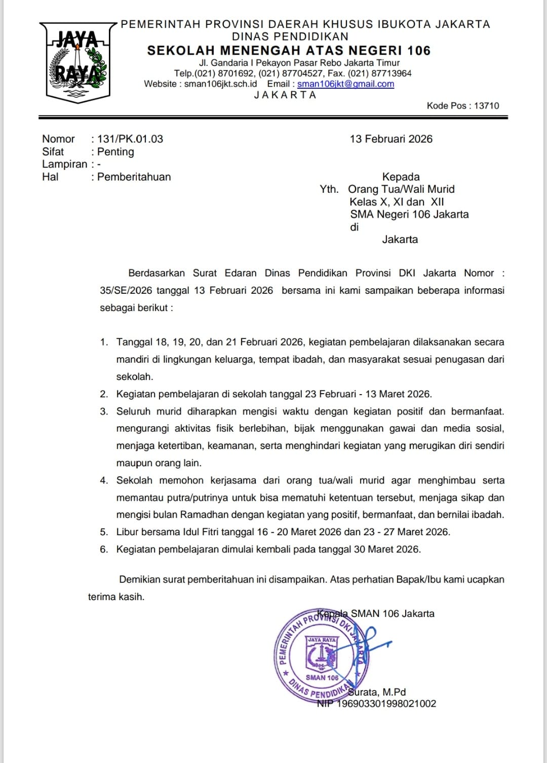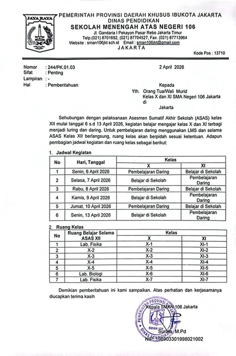 Bidang Akademik SMAN 106 Jakarta berkomitmen untuk menggerakkan pembelajaran yang bermakna melalui penerapan pembelajaran mendalam (deep learning) dalam kerangka Kurikulum Merdeka. Pembelajaran tidak lagi berorientasi pada penguasaan materi semata, tetapi diarahkan pada penguatan pemahaman konsep, penalaran kritis, kreativitas, serta kemampuan reflektif peserta didik. Dengan pendekatan ini, setiap proses belajar diharapkan mampu menumbuhkan rasa ingin tahu, kemandirian belajar, dan keterkaitan pengetahuan dengan konteks kehidupan nyata.